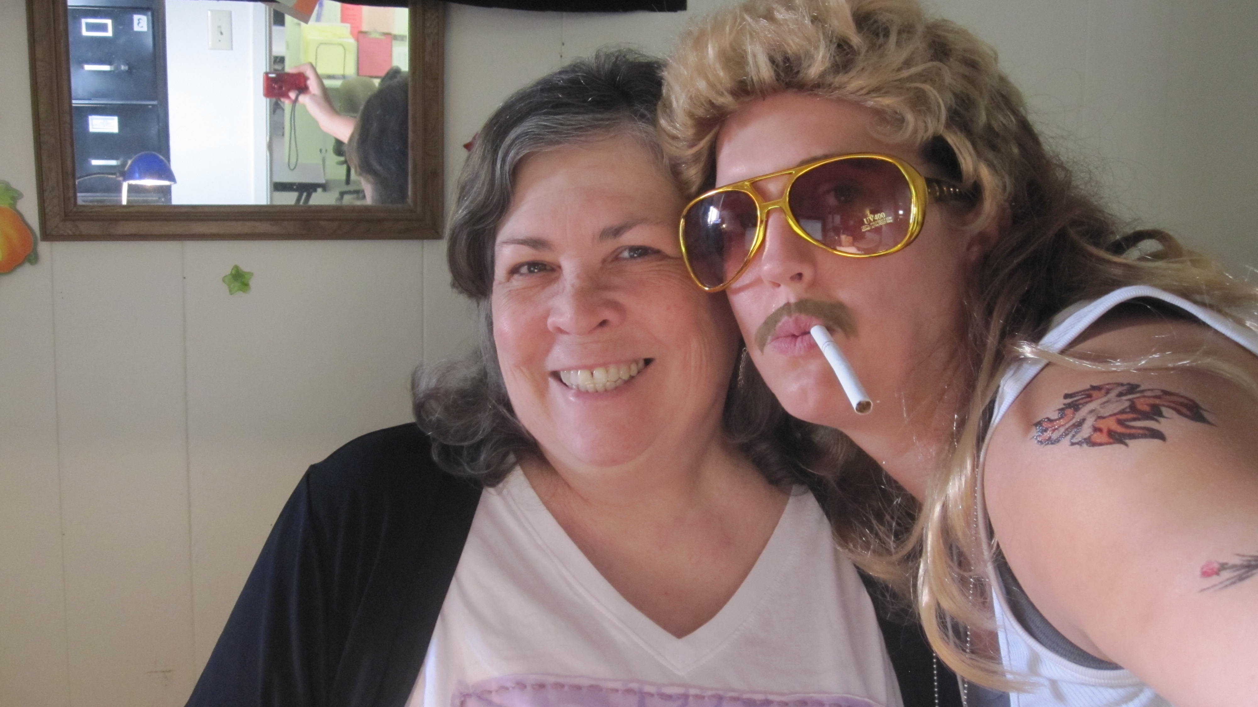 Okay. Now I had no idea what I was going to be when I woke up this morning. I went to my chiropractic appointment and everyone was dressed in costume Dr. Seuss style. That inspired me to get serious with my costume idea. I had to do something different this year. Well I certainly did. I went to the Halloween store, and everything on the shelves for women was sexy kitten this, sexy stripper that. So I went over to the wig section. I was instantly inspired by a mullet wig hanging on the shelf. I picked it up. Thinking to myself for a second, I wondered if I could pull of a southern redneck. Well, Sarah, you were raised in Georgia, and you are from Southern Maryland…so why not? I continued with this idea, and took it one step further by adopting the character of Joe Dirt. I ran home with my press on tattoos, wig, sunglasses…and rushed to get to work. I applied my eyebrow makeup to make bushy eyebrows and a mustache. Threw on a white “wife-beater” tank, jeans, and some “timbs” or work boots.