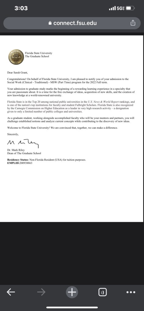 I’m excited to report that I am the newest addition to FSU’s Masters in Social Work Graduate Program. I found out by phone call from one of my application advisors on “Twosday”, 2/22/22. Amber called me and told me I got in, and this letter followed suit the next day. I am over the moon excited!!