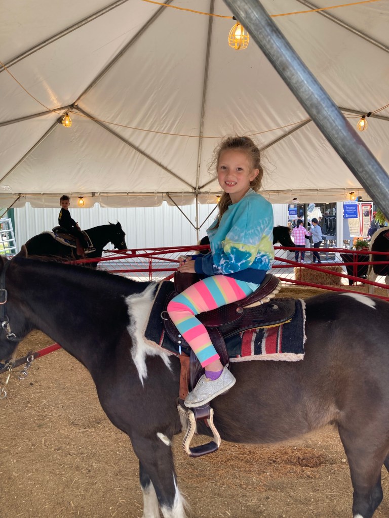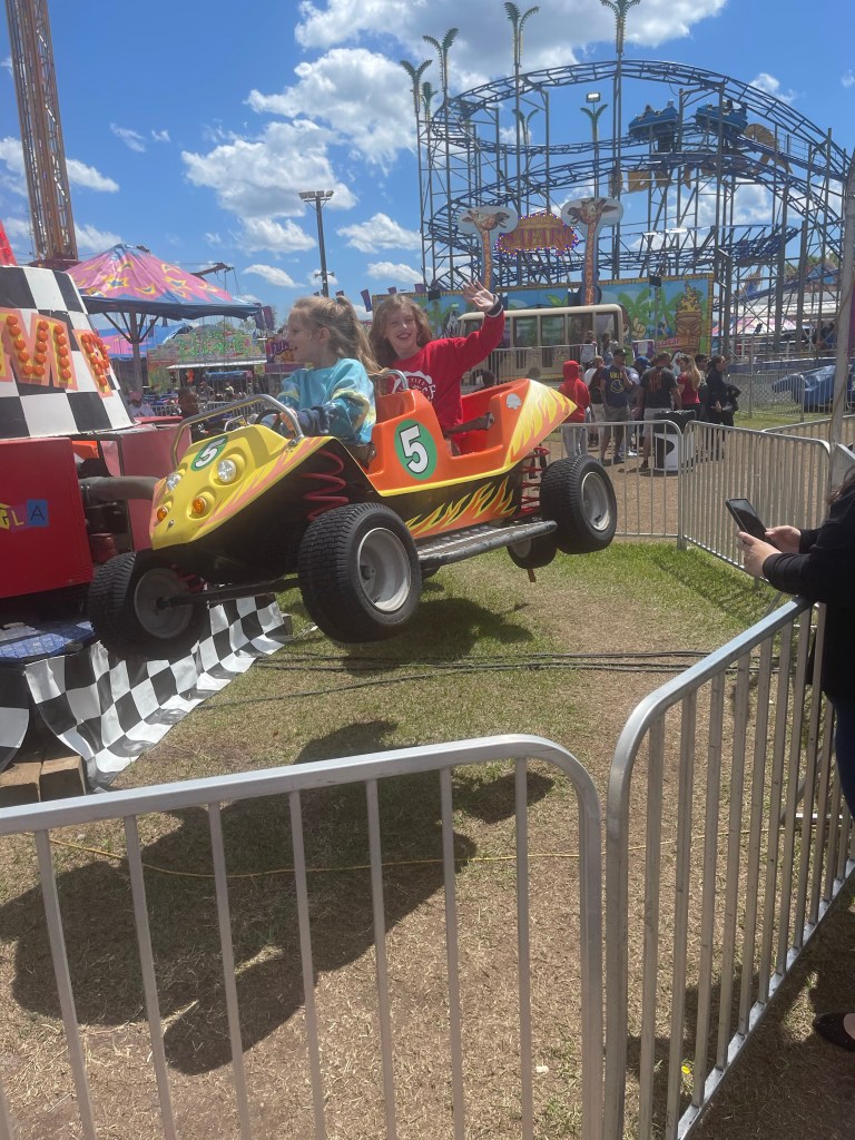 We went through and saw all the animals, petting the cows and goats. Not the pigs, those show pigs are huge. Last year they were able to pet the bunnies too, and Hazel was slightly disappointed they did not have the bunnies out this year for petting. We walked by the coral area and listened to young farmers practice with their whips, and attempting to “crack” the whip. Hazel then insisted on a pony ride, where as Ella darted straight for the highest ride (to a pre-teen) which she picked the high whirling swings. She went alone, and said she would be fine. She of course was a few inches over the sign signaling how tall you had to be in order to ride the swings. She took a spot on the outside, strapped herself in a gave me a thumbs up. My wild child, up for any challenge, daredevil and first born, got such a thrill from that ride. She couldn’t wait for the next one and insisted on the rollercoaster. Just then Jason and Hazel rejoined us.