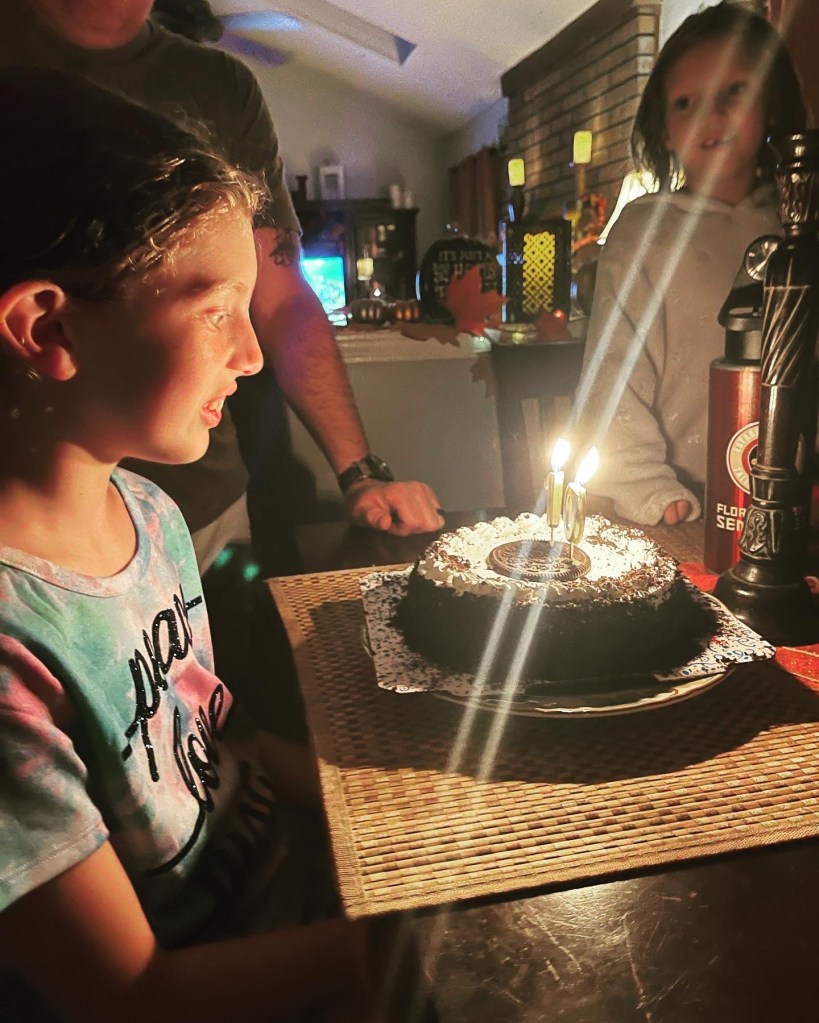 Fast forward through the day, I picked her up from school. We went down to the local gas station for some candy and a Icee. The lady at the counter paid for the girls lollipops and we thanked her for being so kind on Ella’s special day. Next, they requested Chick-Fil-A, and off we went for an early dinner. Ella had football practice later that night. Jason took her to the fields, while I in a fury tore down all the Americana decorations and replaced them with Fall. It is a bit early for Fall I am aware of that, but I simply couldn’t resist. After practice we sang happy birthday, and had a Oreo ice cream cake with some of our local friends.