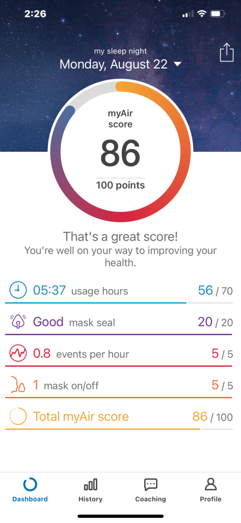 Long story short, I have used the C-pap machine for sleep therapy now for one full week. My O2 levels are back to a healthy 95%, I am extending slowly the time that I am sleeping soundly. The app on my phone is connected with bluetooth technology to my C-Pap machine, storing the data to allow me to view it and my treatment team of multiple drs at mayo clinic. Below, is the data from last night’s sleep record. I slept for 6 full hours nearly with the C-pap machine. To me, this is the best news I have received all week. I have been able to drop alittle weight on my own accord with the sleep improving. 5lbs lost in the past week, and I have been walking 45 minutes in the morning, 3-4x a week and lifting light weights. I am seeing improvement and I am working hard mentally and emotionally to preserve my sanity and not go into hypo-mania. Trust me, this is proving to be very difficult. I was able to stay focused at work, with some minor distractions. I am now heading home after a long productive work day. My goal for tomorrow is to take a much needed rest day (mental health day). I will report back to you what happens and how restful the day proves to be. So far only one major chore on my itinerary. I have the priveledge of escorting one of my GAL kids to a “lunch date”, which is actually to a walk-in drug test for her. She is a sneaky teen doing silly things. I look forward to her lunch date and escorting her to the appointment. Otherwise…rest….that is all I intend to do tomorrrow. After all, tomorrow is another day!!